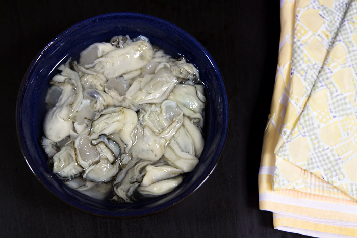 Dip oysters in salt water (4 cups water + 2/3 spoon of sea salt) and shake them gently with your hands
