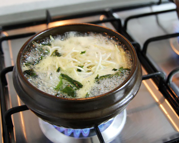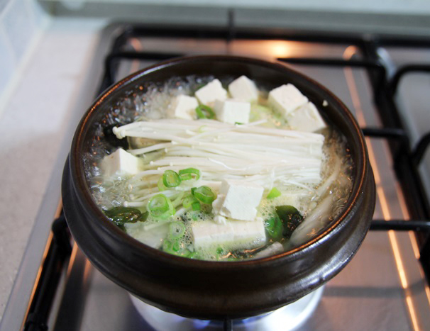 Add minced garlic and enoki mushroom tofu green onions and boil them again.