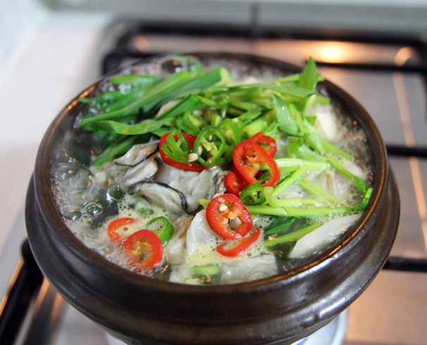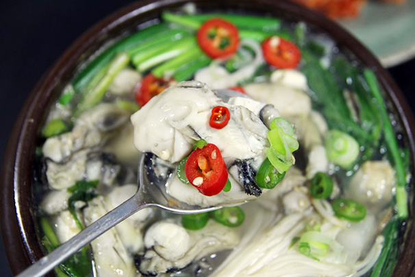 Chubby oysters in white broth… It’s delicious. It’s really cool and delicious.