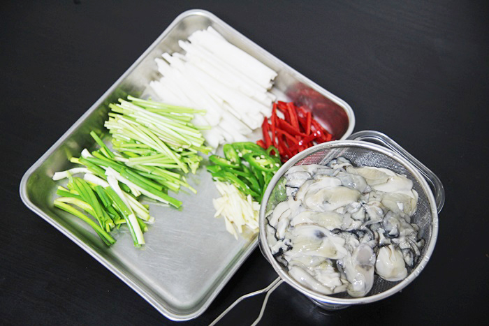 250g oysters, + 1 spoon of lemon juice, 1 handful of shredded radish, 1 handful of water parsley, 5-6 stalks of chives, 1 bowl of shredded garlic, 1 red pepper, 1 cheongyang red pepper
