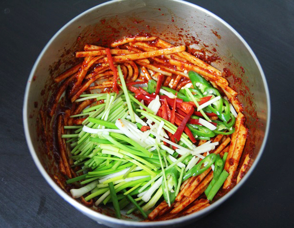 Seasoning: 2~2.5 tablespoons of red pepper powder, 1/2 tablespoons of sugar + a little bit of salt, 2~2.5 tablespoons of anchovy sauce, 3~4 tablespoons of vinegar, 1/3 tablespoons of minced garlic,
